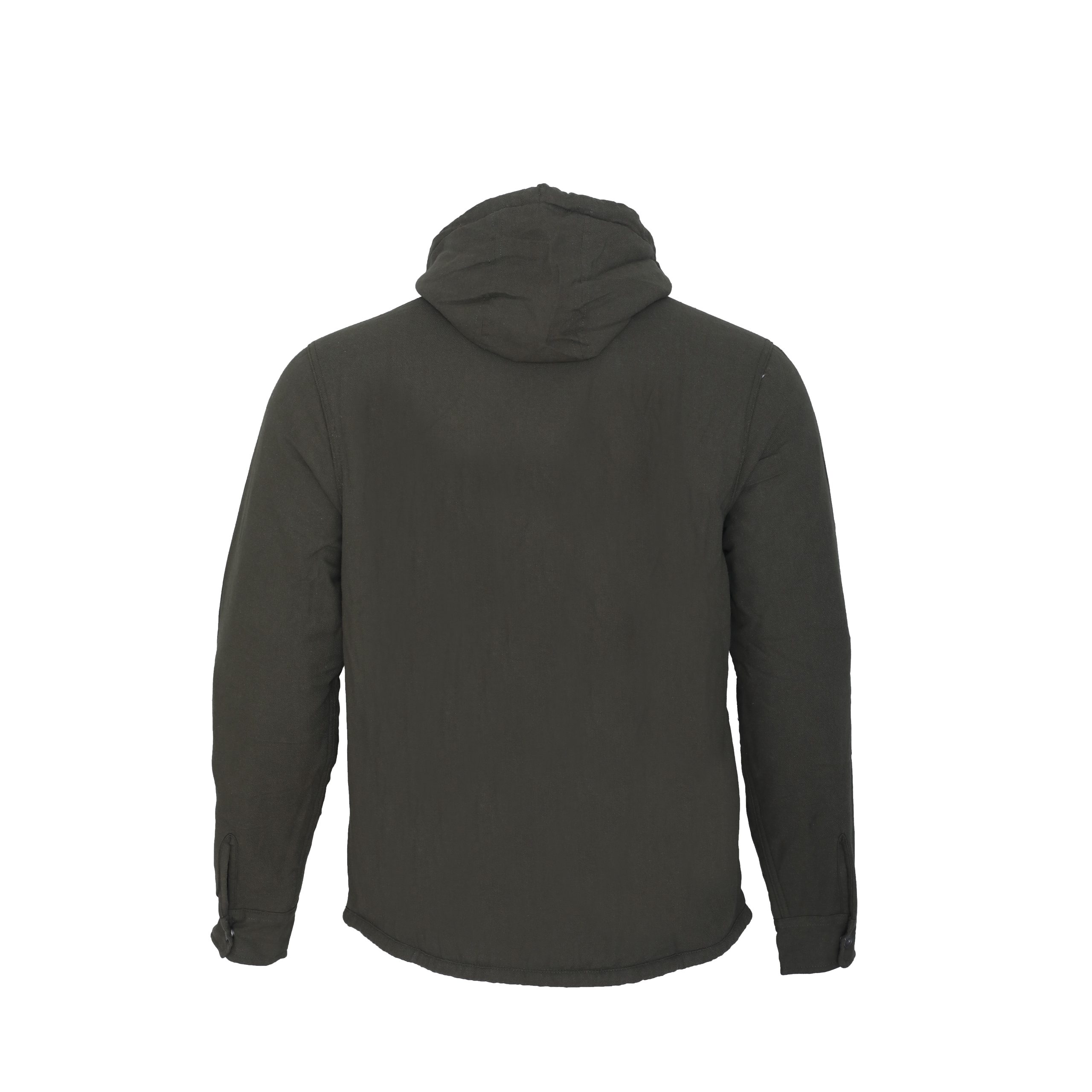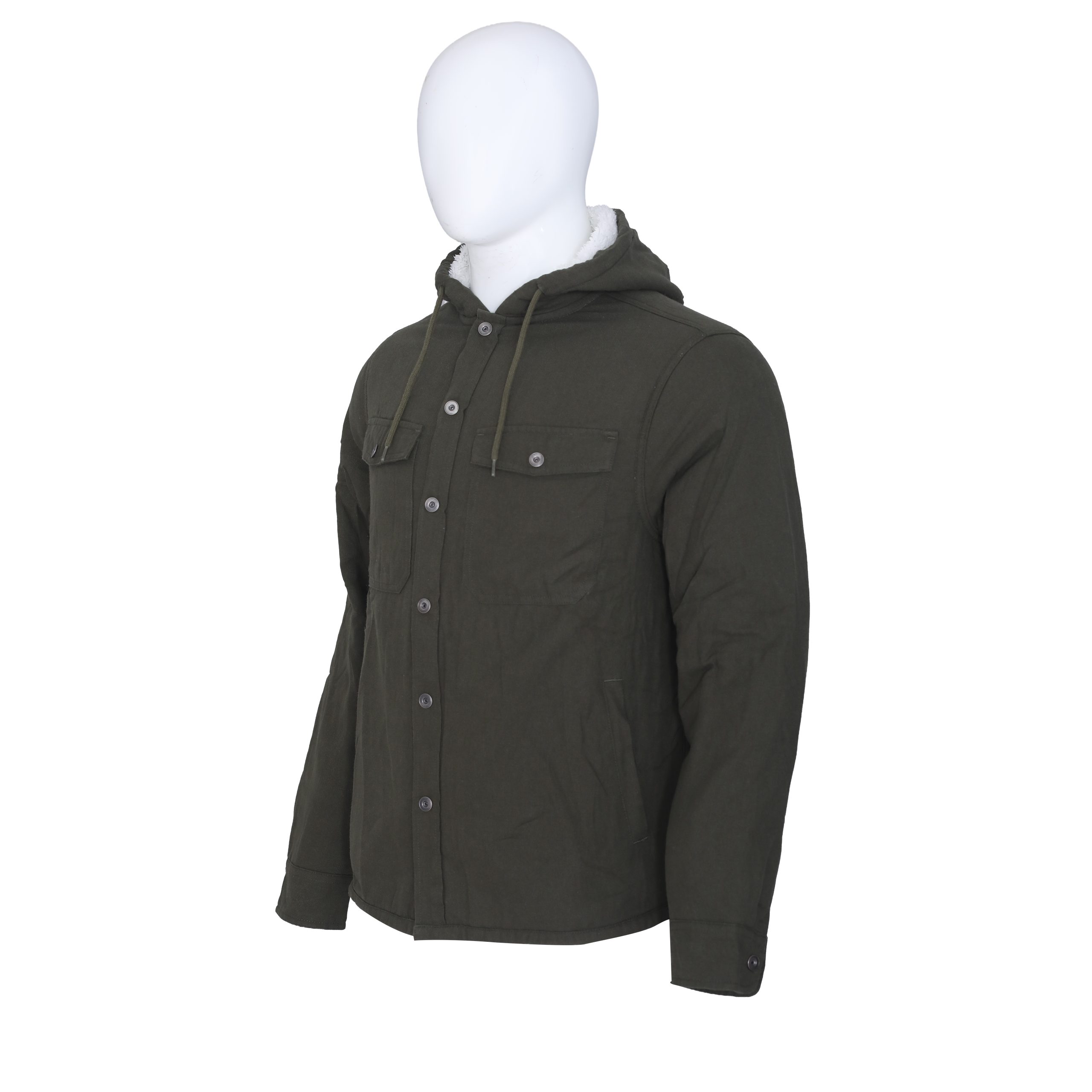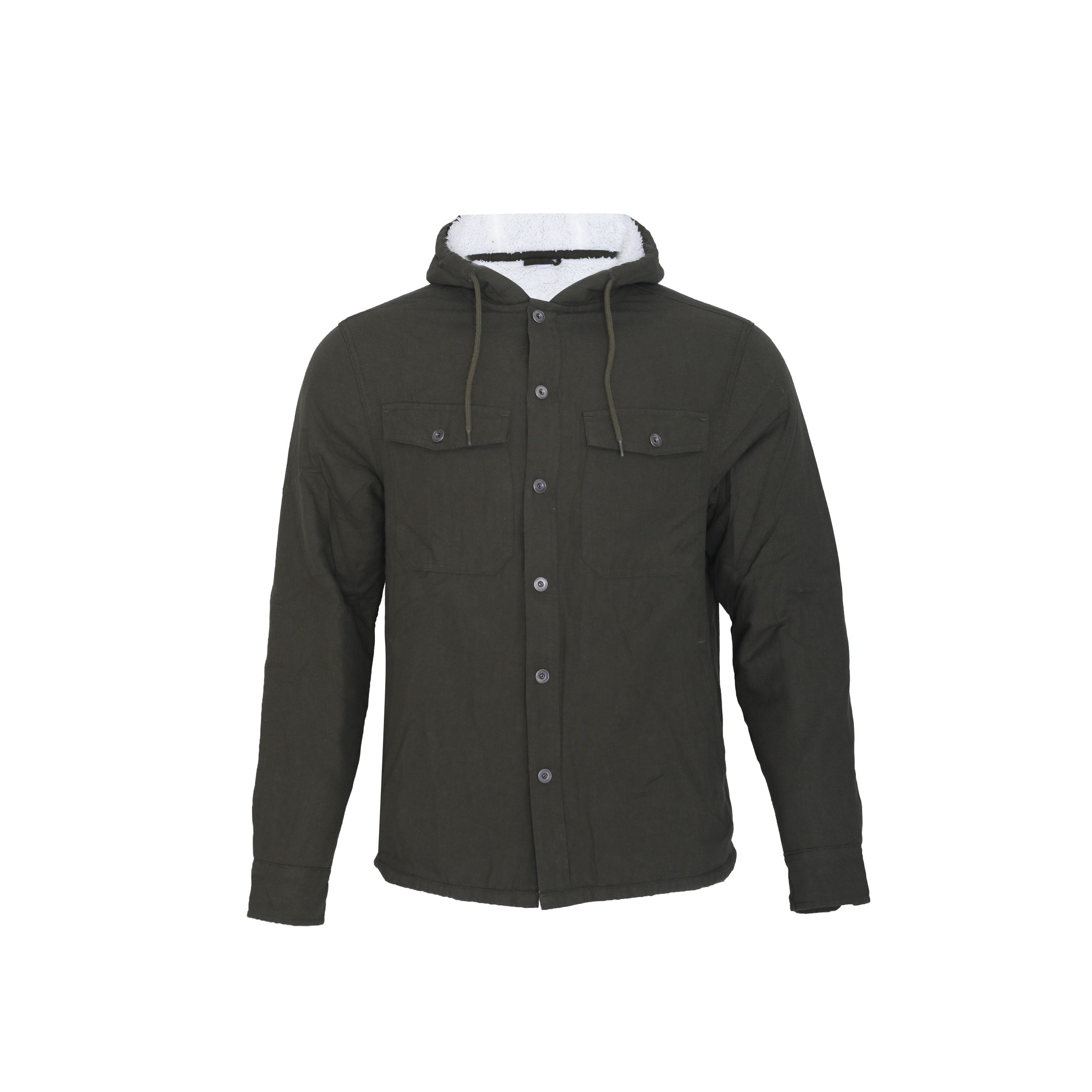 Stay warm in effortless style with this sherpa-lined hooded shirt jacket, designed for comfort during cooler days. Crafted from soft cotton flannel, it delivers a durable, textured feel, while the plush sherpa fleece lining inside the body and hood provides exceptional warmth. The deep, army-green plaid tone brings a rugged yet modern look that pairs seamlessly with denim, cargos, or everyday winter layers.